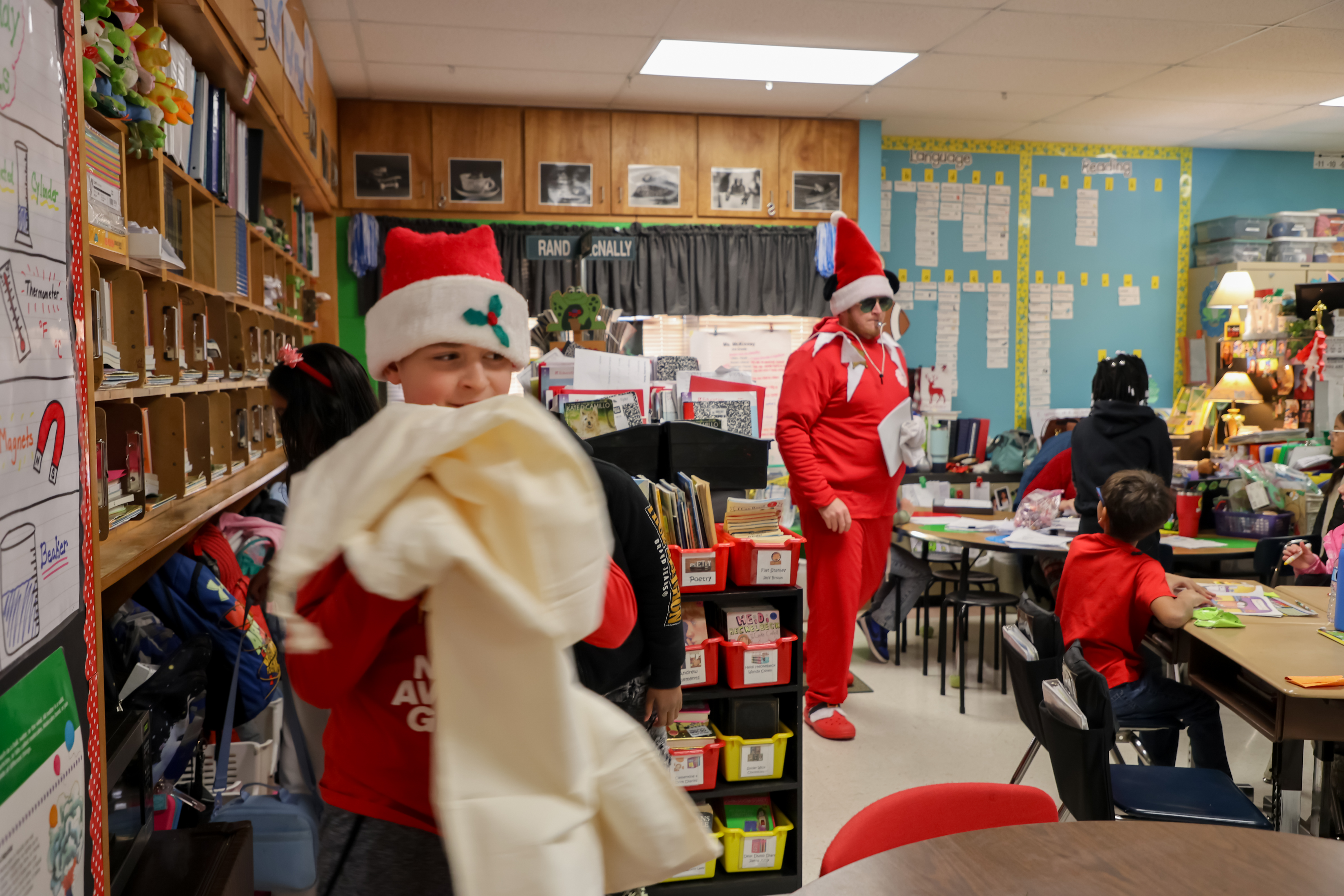 Inside the school, the library became the center of another beloved holiday tradition. Librarian Sarah Brandenburg set up a festive post box where students could drop off Christmas cards for their classmates and teachers. A group of fifth grade students served as the elves, taking turns delivering the cards to classrooms each day.